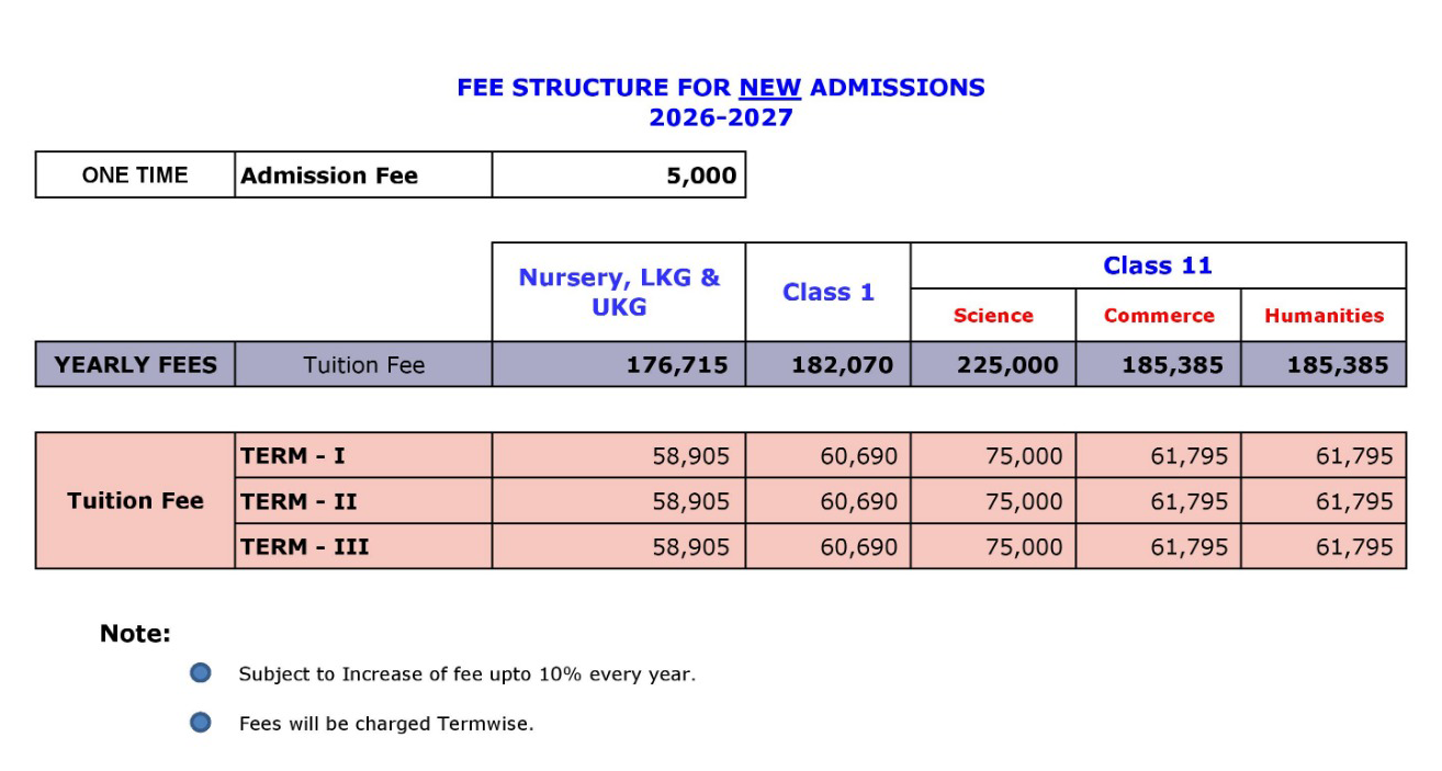FEE STRUCTURE Appeal for voluntary contribution as per applicable income tax rules. Click Here ADMISSIONSFEE STRUCTUREUNIFORMTRANSPORTNATIONAL EDUCATION POLICY